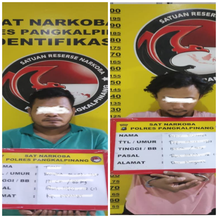 Satuan Reserse (Satres) Narkoba Polresta Pangkalpinang mengamankan dua tersangka yang diduga sebagai pengedar narkoba jenis sabu di wilayah Kota Pangkalpinang, yakni Toni alias Nobo (34), warga Jalan Nanas II RT 007 RW 003 Kelurahan Keramat Kecamatan Rangkui Kota Pangkalpinang dan Deky Riyandi alias Kucing (32), warga Jalan Binjai Mangkol RT 002 RW 003 Desa Mangkol Kecamatan Pangkalan Baru Kabupaten Bangka Tengah.