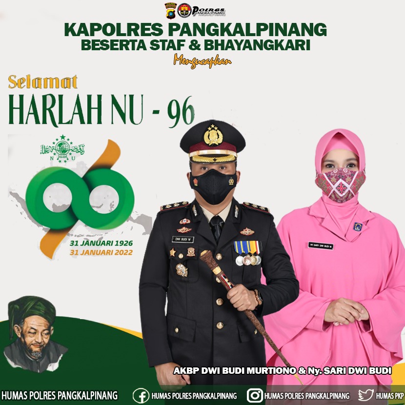 Humas Polres Pangkalpinang – Kapolres Pangkalpinang AKBP Dwi Budi Murtiono, S.IK M,H beserta jajaran mengucapkan selamat Hari Lahir Nahdlatul Ulama (NU) ke 96 di tahun 2022, dimana Hari Lahir NU diperingati setiap tanggal 31 Januari setiap tahunnya.