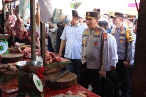Kapolda bersama rombongan menyambangi satu persatu para pedagang mulai dari pedagang cabe, pedagang bawang, pedagang sayur, pedagang ayam hingga pedagang daging sapi.