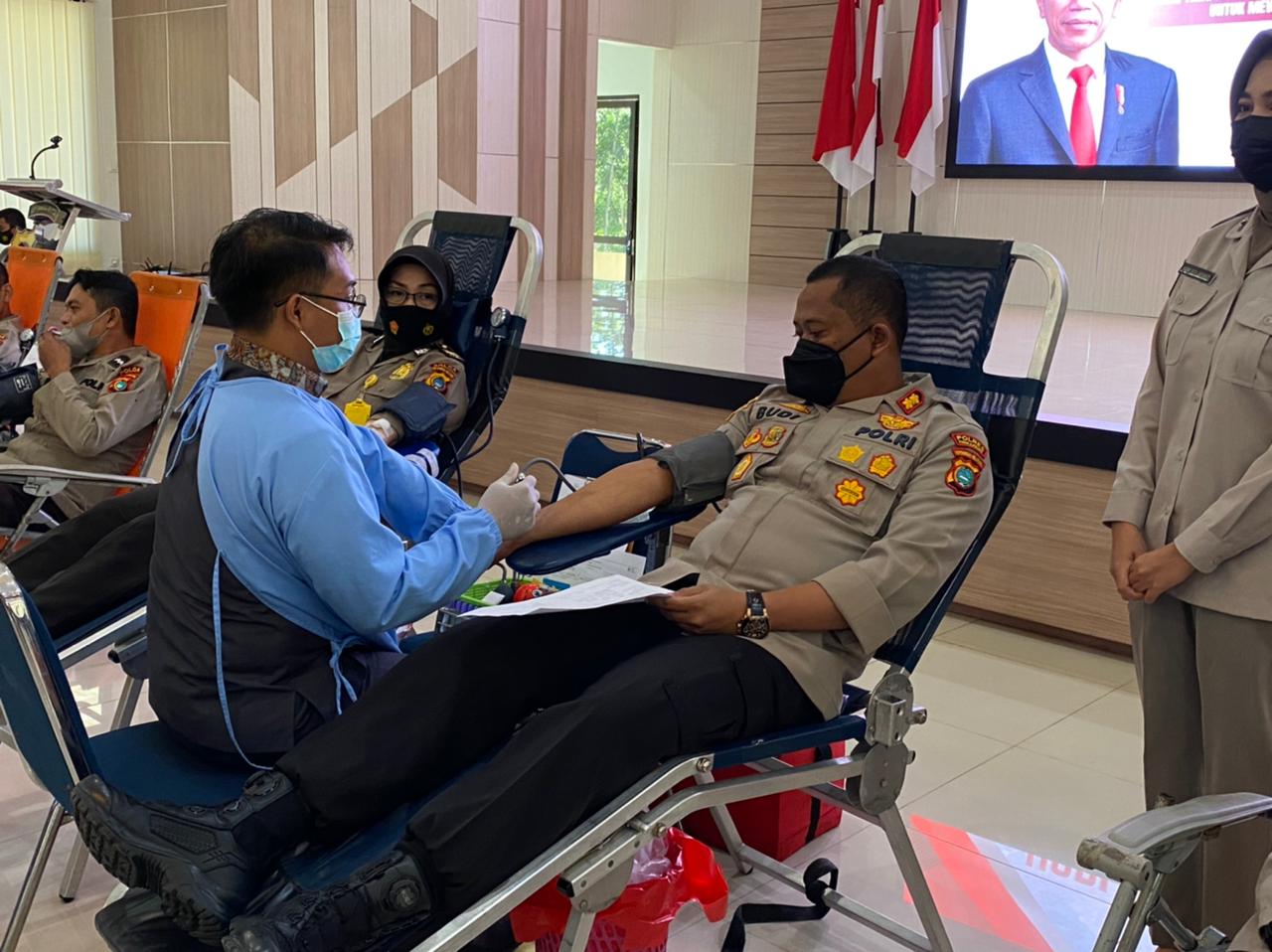 Humas Polres Pangkalpinang – Dalam rangka menyambut Hari Bhayangkara Ke 76 yang jatuh pada tanggal 1 Juli 2022, Polres Pangkalpinang bersama jajarannya mengikuti bakti sosial donor darah yang digelar Polda Kep. Bangka Belitung, bertempat di gedung Tri Brata Polda Kep. Babel. Selasa (7/6).