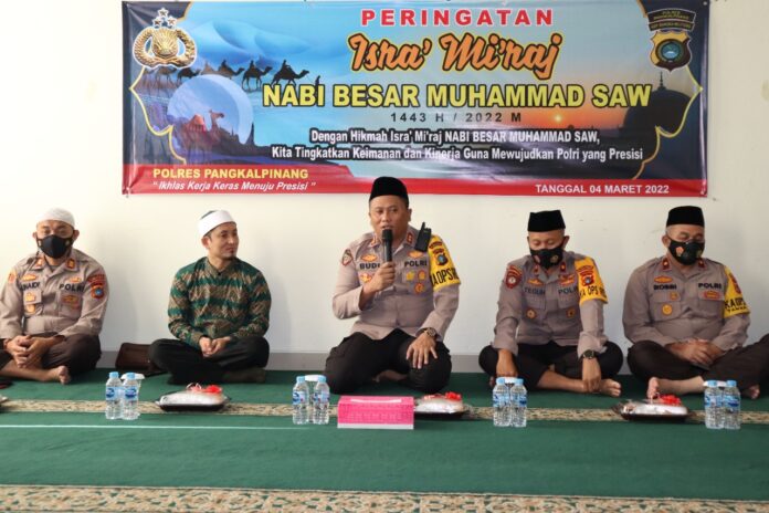 Dalam ceramahnya menyampaikan bahwa pelaksanaan Isra Mi’raj yang diperingati setiap tahun dapat meningkatkan keimanan dan ketaqwaan kita kepada Allah SWT bagi anggota Polri dan Keluarga besar di lingkungan Polres Pangkalpinang.