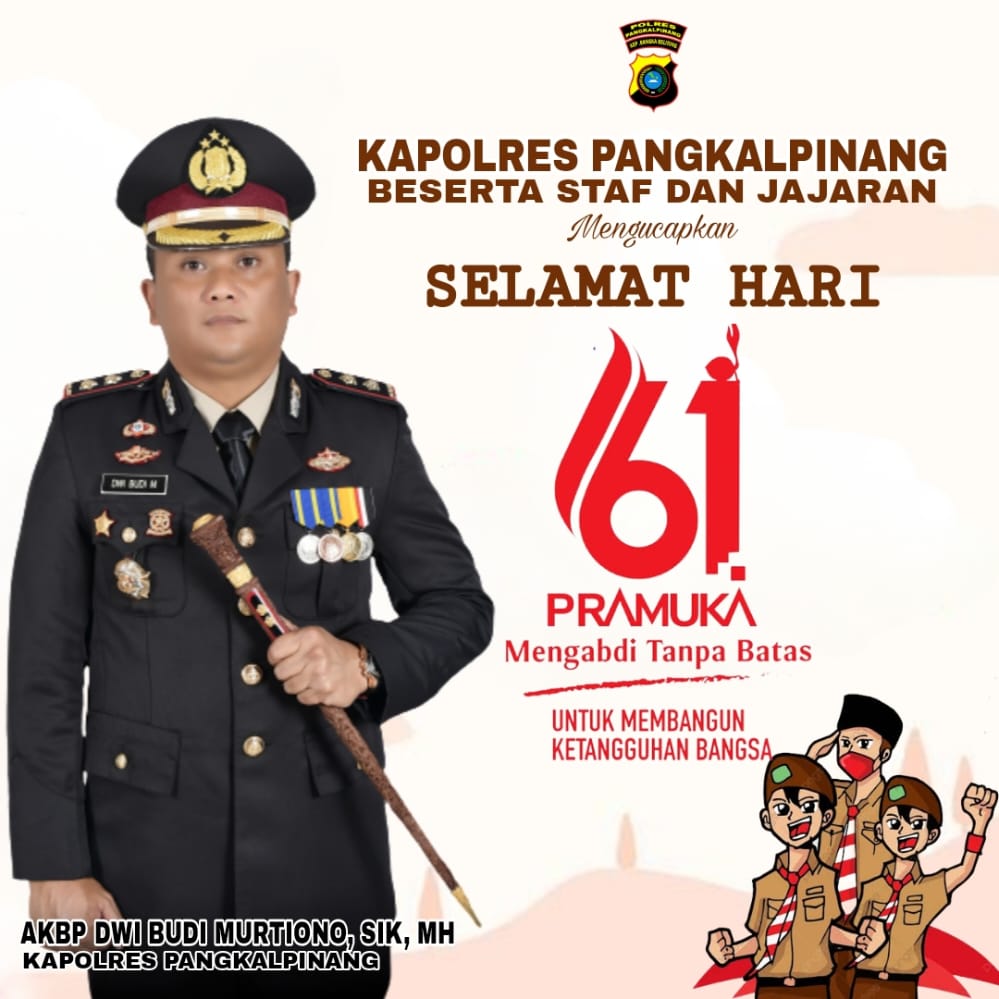 Kapolres Pangkalpinang AKBP Dwi Budi Murtiono, S.IK M.H, beserta staf dan jajaran memberikan ucapan ” Selamat Hari Pramuka ke 61 Tahun 2022.