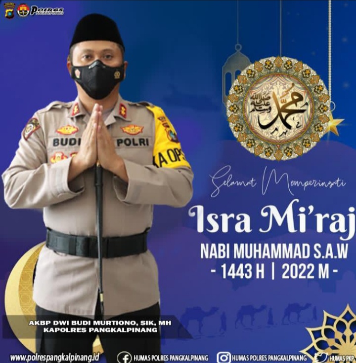 Humas Polres Pangkalpinang – Kapolres Pangkalpinang AKBP Dwi Budi Murtiono, S.IK, M.H, beserta staf dan Bhayangkari, mengucapkan selamat memperingati Isra Mikraj Nabi Muhammad SAW, yang jatuh pada hari ini Senin 28 Februari 2022.