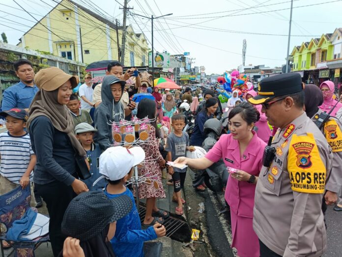 Di tengah keramaian pawai yang berlangsung di Simpang Tujuh (DKT) Kecamatan Taman Sari, Kapolresta bersama Bhayangkari mendekat langsung ke masyarakat untuk berbagi kebahagiaan.