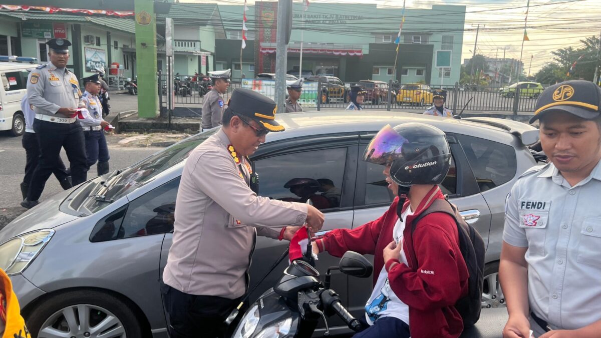 Pangkalpinang — Dalam rangka menyambut Hari Ulang Tahun (HUT) ke-80 Kemerdekaan Republik Indonesia, Kapolresta Pangkalpinang Kombes Pol Max Mariners, S.I.K., M.H. melaksanakan kegiatan pemasangan atribut kemerdekaan berupa bendera kecil kepada para pengendara di Simpang Tujuh (DKT) Kota Pangkalpinang.