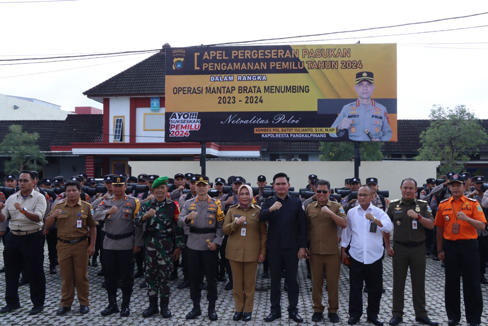Hadir pada apel pergeseran pasukan TPS Pj Walikota Pangkalpinang, Ketua Bawaslu Kota Pangkalpinang, Komisoner KPU, Asisten bidang pemerintahan Kota Pangkalpinang, Kasat Pol PP Kota Pangkalpinang, Kesbangpol Kota Pangkalpinang, BPBD, Wakapolresta Pangkalpinang AKBP Rendra Oktha Dinata, S.IK M.Si, Para Kabag, Kasat dan Kapolsek jajaran dan personel Polresta Pangkalpinang.