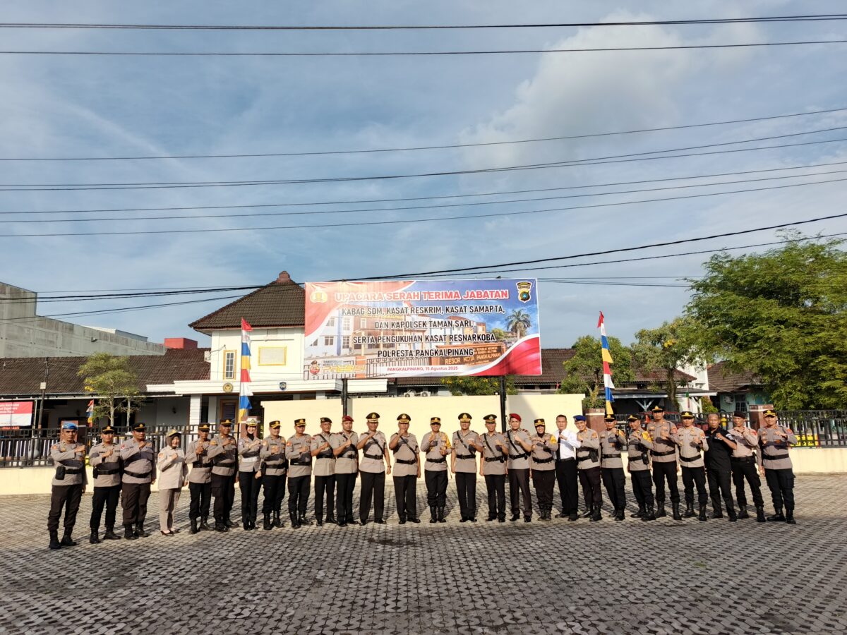 Pangkalpinang — Kapolresta Pangkalpinang memimpin langsung upacara serah terima jabatan (Sertijab) dan pengukuhan jabatan Pejabat Utama (PJU) Polresta Pangkalpinang, yang berlangsung di halaman Mapolresta Pangkalpinang, Jum’at (15/8/25).