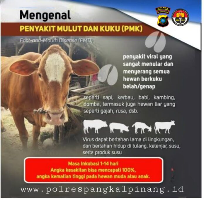 HomeBeritaKENALI PENYAKIT MULUT DAN KUKU (PMK) PADA HEWAN TERNAKBeritaKENALI PENYAKIT MULUT DAN KUKU (PMK) PADA HEWAN TERNAKBy @dminJuly 16, 2022010017ShareFacebookWhatsAppTelegram KENALI PENYAKIT MULUT DAN KUKU (PMK) PADA HEWAN TERNAKShareFacebookWhatsAppTelegram Previous articleNext articlePolri Buru KKB Papua Pembunuh Pendeta dan 9 Warga@dminhttps://polrestapangkalpinang.idRELATED ARTICLES BeritaPeduli Korban Kebakaran, Kapolresta Pangkalpinang Turun Langsung Beri Bantuan August 14, 2024 BeritaKunjungan Kerja Perdana Kapolda Kep. Bangka Belitung Ke Polresta Pangkalpinang August 14, 2024 BeritaPolresta Pangkalpinang Terima Kunjungan Ombudsman RI, Cek Kualitas Fungsi Pelayanan Publik August 8, 2024 LEAVE A REPLY Cancel replyComment:Please enter your comment! Name:*Please enter your name here Email:*You have entered an incorrect email address!Please enter your email address here Website: Save my name, email, and website in this browser for the next time I comment. KAPOLRESTA PANGKALPINANGKOMBES POL MAX MARINERS, S.I.K., M.HMost PopularPolresta Pangkalpinang Gelar Sosialisasi DIPA/RKA-KL, Pakta Integritas, dan Penyusunan Rendisgar T.A. 2026 January 9, 2026 Panen Raya Jagung Serentak Kuartal I 2026, Wujud Nyata Dukungan Ketahanan Pangan January 8, 2026 Mediasi Laka Lantas di Polsek Gerunggang, Dua Pihak Sepakat Selesaikan Secara Kekeluargaan January 7, 2026 Kapolresta Pangkalpinang Pimpin Pengamanan Aksi Damai Aliansi Rakyat Babel Bersatu January 5, 2026 Load moreRecent Comments