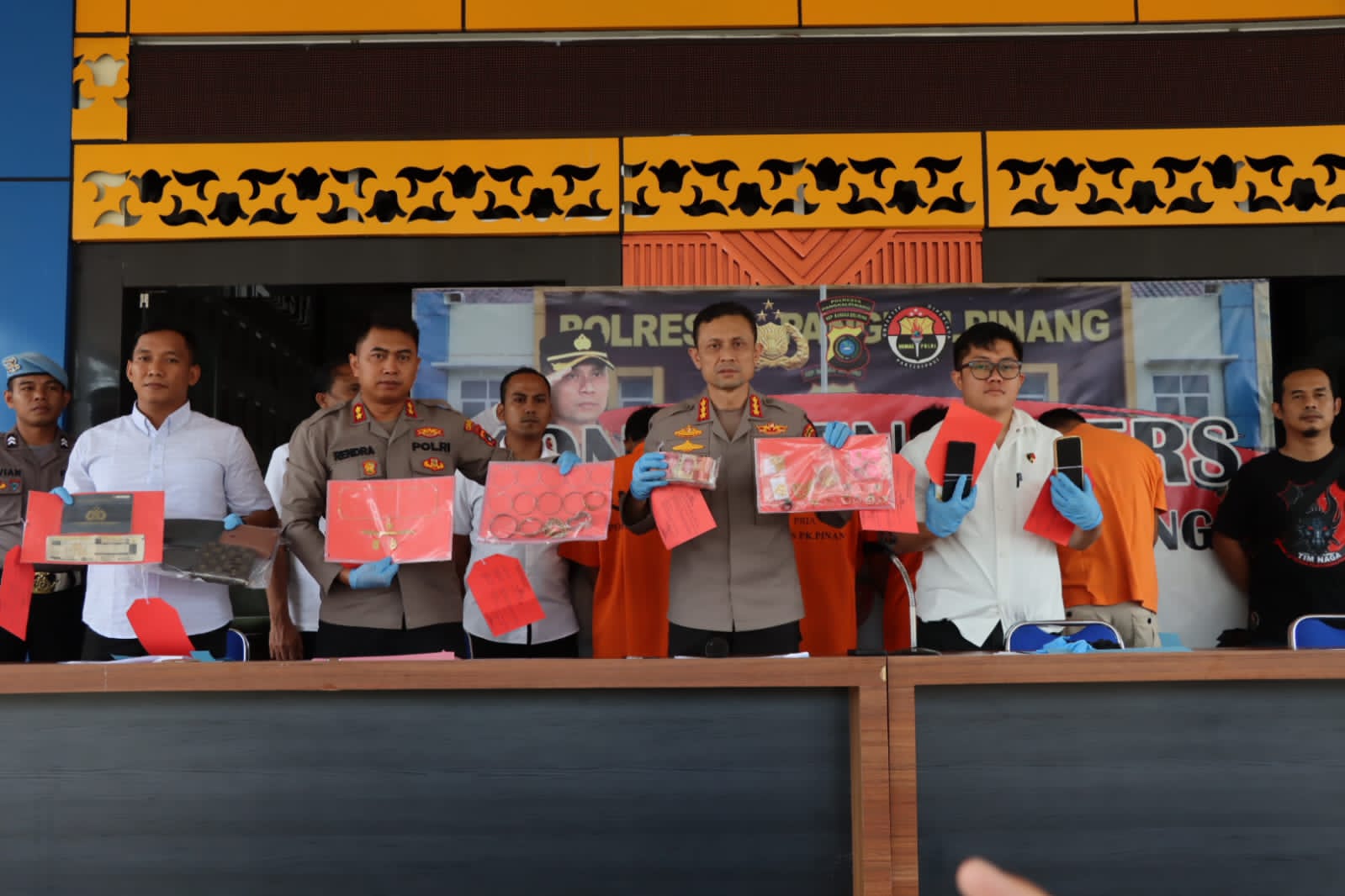 Kapolresta Polres Pangkalpinang KBP Gatot Yulianto, S.I.K, M.HP didampingi Wakapolresta Pangkalpinang AKBP Rendra Oktha Dinata, S.I.K, M.Si, Kasat Reskrim Polresta Pangkalpinang AKP Muhammad Riza Rahman, S.I.K dan Kanit Pidum IPDA Fajar Restu Amarullah dalam konferensi pers mengungkapkan, kelima pelaku tersebut ditangkap pada waktu dan tempat berbeda.