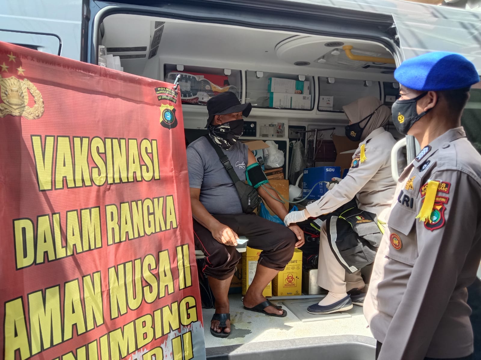 Memantau kegiatan vaksinasi, Karendal Ops Res Kompol Andri Eko Setiawan, SH, S.IK didampingi personil operasi dan vaksinator Dokkes Polres Pangkalpinang.