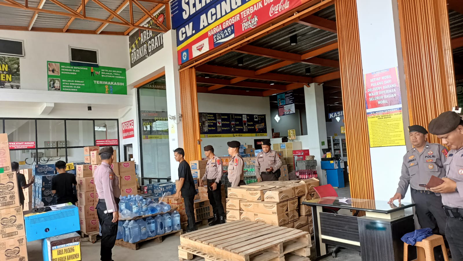 Dalam Patroli Dialogis dan mengecek pada tempat perbelanjaan Kasatgas preventif AKP Fery Gunadi bersama 8 (delapan) personelnya, Melakukan Pengecekan Persiapan Pelaksanaan Nataru Tahun 2022 Pada Tempat Perbelanjaan CV. Acing Perkasa Pangkalpinang sebagai langkah sterilisasi diseputaran lok