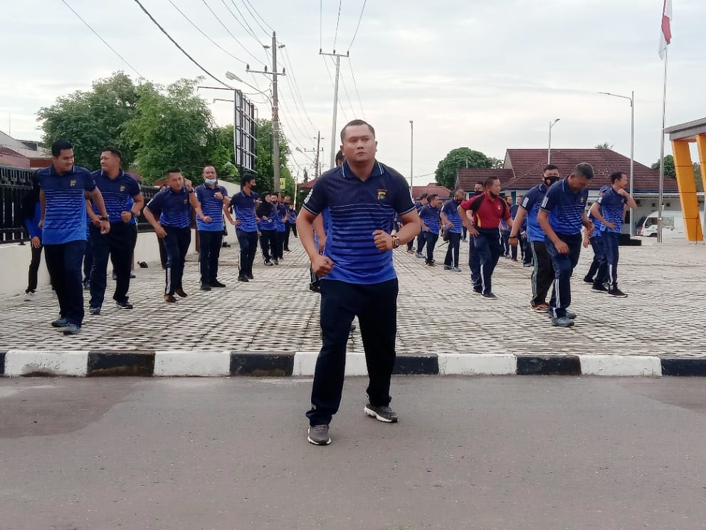 Dengan diiringi musik, instruktur senam membimbing seluruh personel Polres Pangkalpinang melakukan gerakan-gerakan senam.