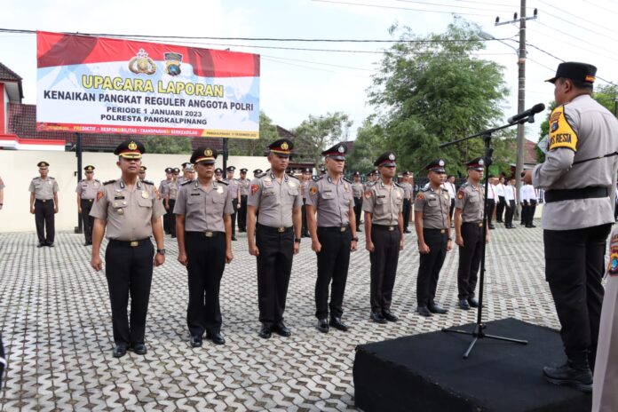 Humas Polresta Pangkalpinang – Tiga Puluh Empat personil Polresta Pangkalpinang mendapatkan kenaikan pangkat setingkat lebih tinggi, kenaikan pangkat tersebut di tandai dengan pelaksanaan Upacara laporan kenaikan pangkat reguker personil Polri periode 1 Januari 2023.