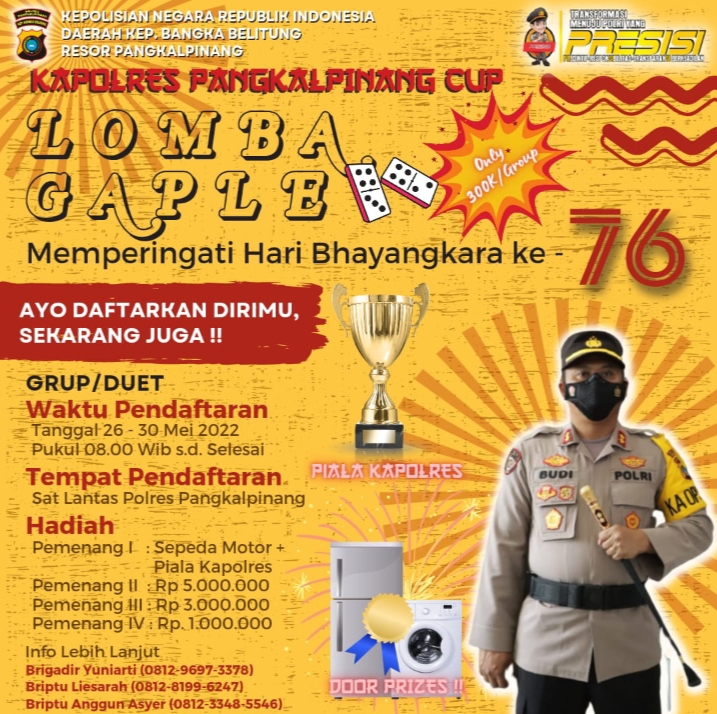 Turnamen Gaple dalam rangka memperingati HUT Bhayangkara ke 76 ini, akan memperebutkan Piala Kapolres Pangkalpinang, Sepeda motor dan uang tunai. Panitia juga telah menyiapkan Door prize berupa Lemari es dan mesin cuci, serta banyak lagi hadiah lainnya.