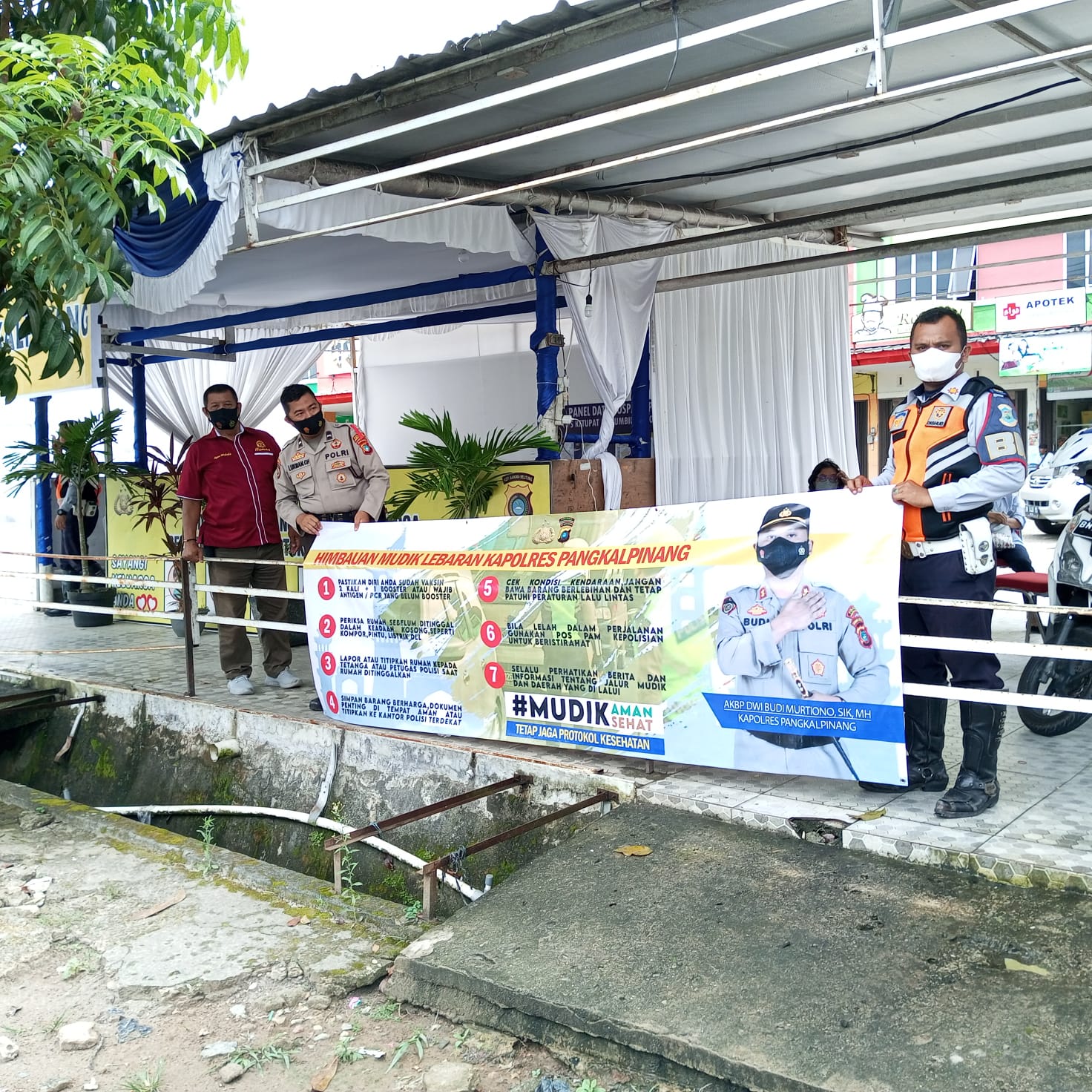 Kapolres Pangkalpinang AKBP Dwi Budi Murtiono, S.IK, M.H, Melalui Kasi Humas AKP Agus Widodo mengataka, Kegiatan pemasangan Spanduk himbauan kamtibmas menjelang mudik lebaran guna mengingatkan kembali kepada masyarakat untuk memastikan sudah di vaksin tahap 1, tahap II dan Bosster, periksa dahulu sebelum meninggalkan rumah, lapor atau titipkan rumah kepada tetangga atau Bhabinkamtibmas saat rumah ditinggalkan, simpan barang berharga atau dokumen penting ditempat aman atau dititipkan dikantor Polisi terdekat, cek kondisi kendaraan sebelum mudik, istirahat di pos pam atau pos yan kepolisian apabila lelah saat berkendara, selalu perhatikan berita dan informasi tentang jalur mudik dan daerah yang dilalui, terang Kasi Humas.