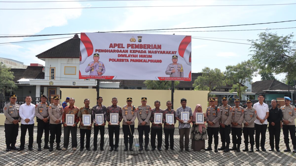 Pangkalpinang — Kepolisian Resor Kota (Polresta) Pangkalpinang menggelar apel pemberian penghargaan kepada tokoh masyarakat yang dinilai berperan aktif dalam menjaga situasi kamtibmas tetap kondusif di wilayah hukum Polresta Pangkalpinang. Kegiatan tersebut berlangsung di halaman Mapolresta Pangkalpinang pada hari Kamis 06 November 2025, dipimpin langsung oleh Kapolresta Pangkalpinang Kombes Pol Max Mariners., S.I.K., M.H.