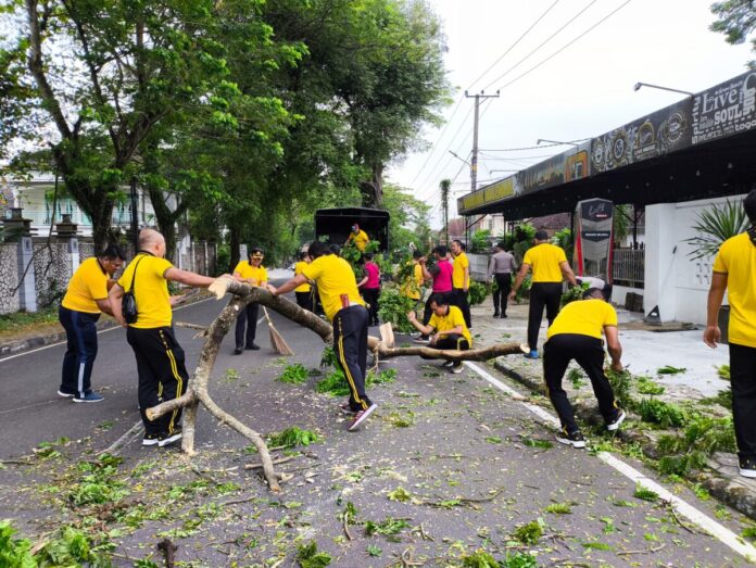 Sejak pagi, personel terlihat membersihkan area taman, jalan sekitar, serta mengevakuasi dan membersihkan pohon tumbang di jalan sehingga mengganggu kenyamanan dan keselamatan pengguna jalan.