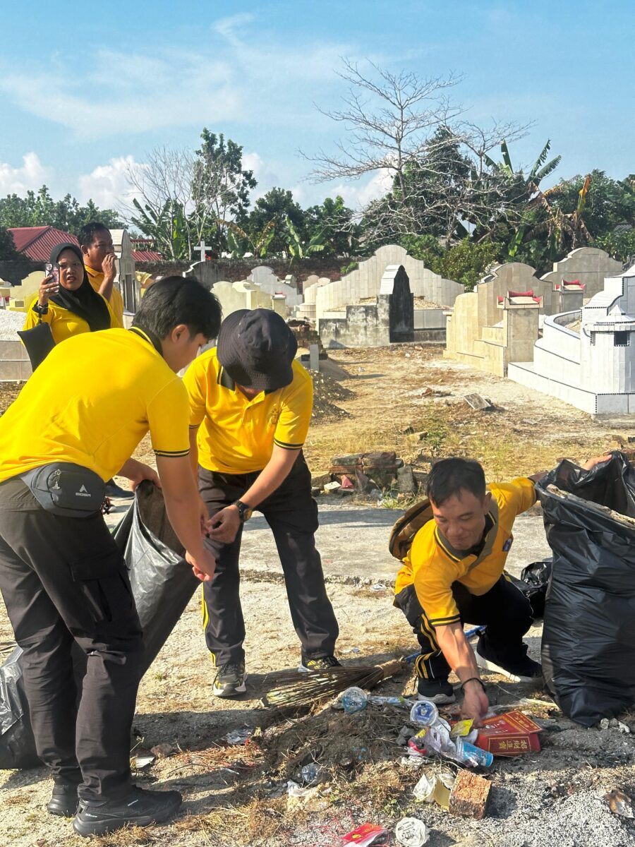 Personel bersama-sama membersihkan area sekitar pekuburan dengan memotong dan mencabut rumput, mengangkat sampah, serta merapikan lingkungan agar tetap bersih dan nyaman.