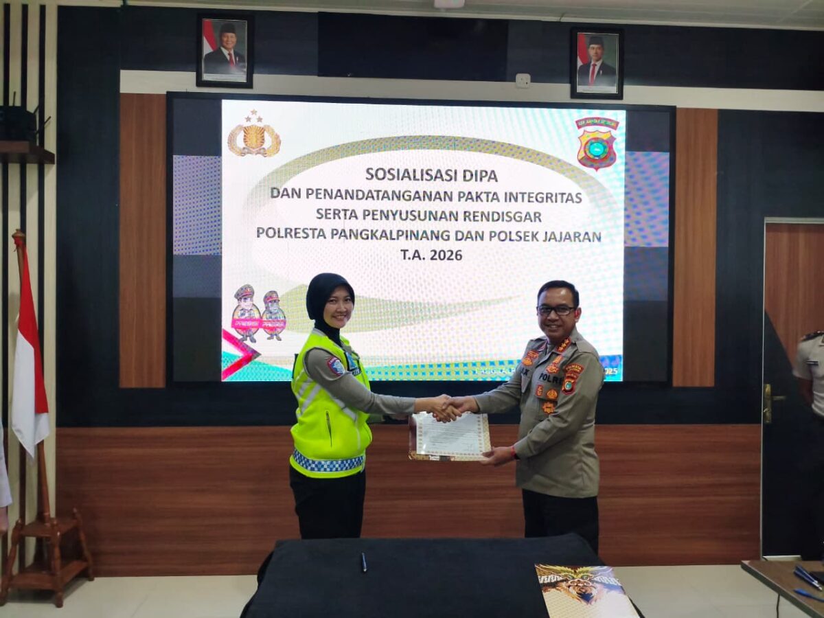PANGKALPINANG – Polresta Pangkalpinang melaksanakan kegiatan sosialisasi DIPA/RKA-KL yang dirangkaikan dengan penandatanganan Pakta Integritas serta penyusunan Rencana Distribusi dan Penggunaan Anggaran (Rendisgar) Tahun Anggaran 2026 di Aula SAR Polresta Pangkalpinang, Selasa (6/1/26).
