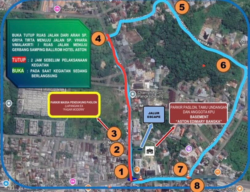 Satuan Lalu Lintas (Satlantas) Polresta Pangkalpinang mengumumkan akan melakukan pengalihan arus lalu lintas sehubungan dengan pelaksanaan debat publik pasangan calon Wali Kota dan Wakil Wali Kota Pangkalpinang yang dijadwalkan berlangsung pada hari Jumat 8 Agustus 2025 pukul 19.30 WIB bertempat di Aston Emidary Bangka Hotel & Conference Center.