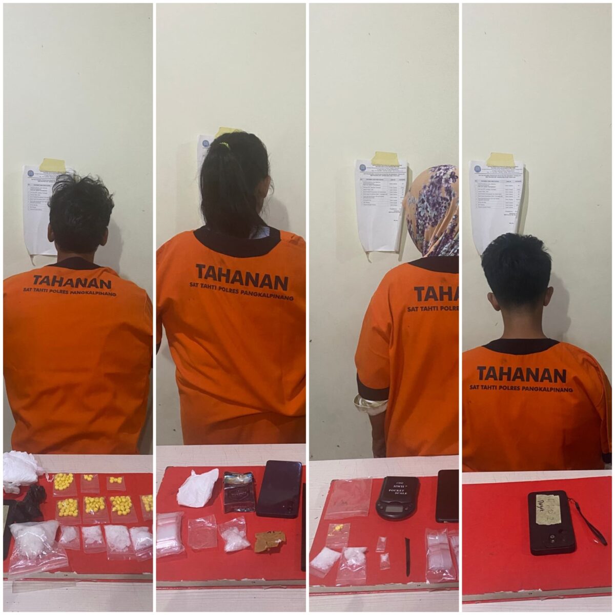 Pangkalpinang — Satuan Reserse Narkoba Polresta Pangkalpinang kembali menorehkan prestasi dalam mengamankan pelaku peredaran narkotika. Empat orang tersangka berhasil diamankan pada Selasa, 29 Juli 2025. Para tersangka yang ditangkap adalah Hendra Setiawan alias Hendra (34), Susanti (49), Eyny alias Dayang (34) dan Raup Hidayatullah alias Dayat (31). Keempatnya diduga kuat terlibat dalam jaringan peredaran narkotika jenis sabu dan ekstasi di wilayah Bangka Tengah dan Pangkalpinang.