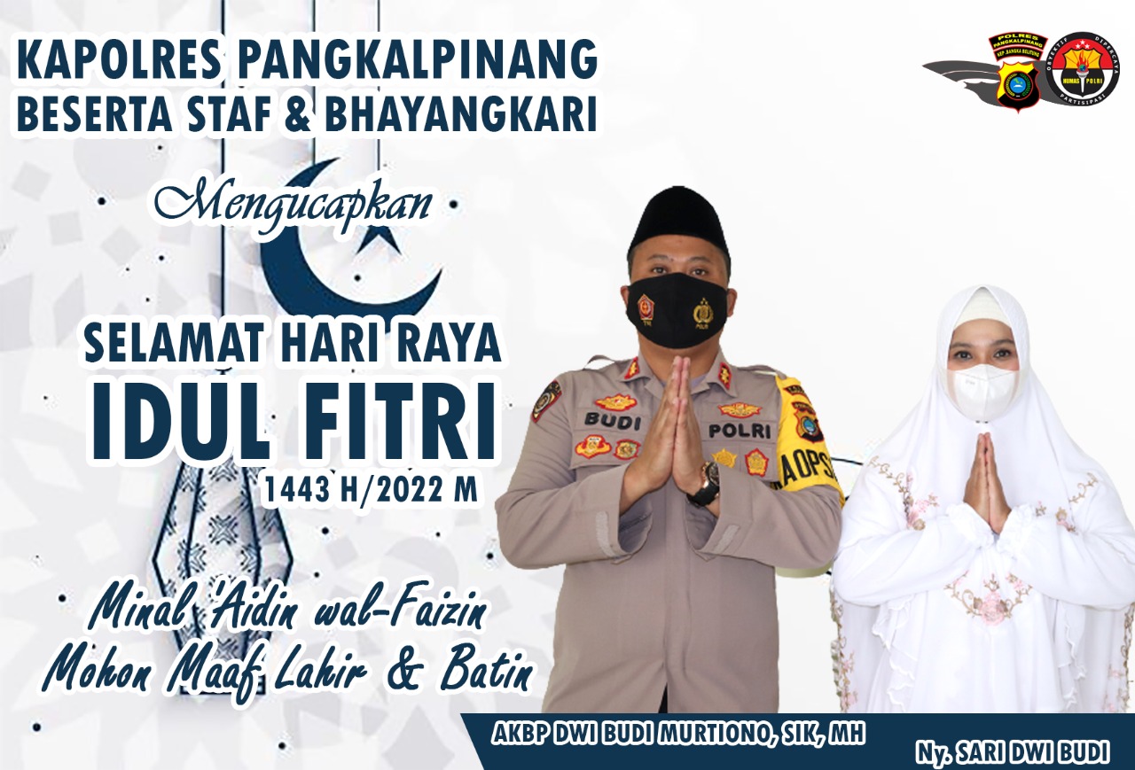 Humas Polres Pangkalpinang – Menyambut Hari Kemenangan Idul Fitri 1443 H 2022 M, Kapolres Pangkalpinang AKBP Dwi Budi Murtiono, S.IK, M.H, bersama Ketua Bhayangkari Cabang Pangkalpinang Ny. Sary Dwi Budi, menyampaikan ucapan selamat Idul Fitri serta memohon maaf lahir dan batin kepada masyarakat Pangkalpinang dan seluruh personil Polres Pangkalpinang “Semoga segenap amal ibadah yang telah kita laksanakan dalam bulan Ramadhan akan diterima Allah sebagai amal saleh,” ucap Kapolres.