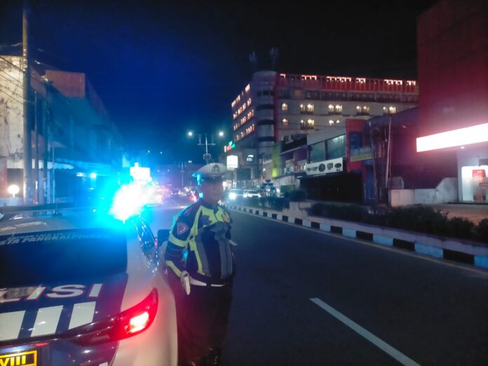 a malam hari secara mobile dengan rute acak menggunakan sarana mobil Patroli dinas Sat Lantas dan menyalakan sorot lampu rotator khas Kepolisian yang berwana biru.