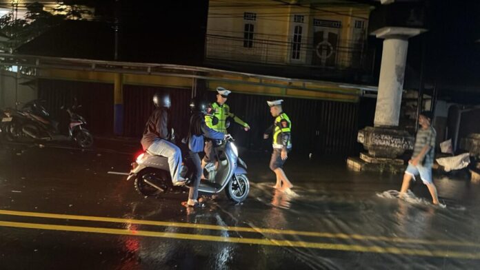 PANGKALPINANG – Cuaca ekstrem berupa hujan lebat yang disertai petir dan angin kencang yang melanda Kota Pangkalpinang dalam beberapa hari terakhir menyebabkan terjadinya banjir dan genangan air di sejumlah ruas jalan utama, sehingga mengganggu kelancaran lalu lintas dan aktivitas masyarakat. Menindaklanjuti hal tersebut, Satuan Lalu Lintas (Satlantas) Polresta Pangkalpinang segera mengerahkan personel untuk melaksanakan pengaturan dan pengamanan arus lalu lintas di lokasi yang terdampak, Jum’at Malam (3/4/2026).