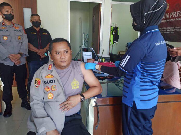 Humas Polres Pangkalpinang – Kapolres Pangkalpinang AKBP Dwi Budi Murtiono, S.IK, M,H, didampingi Wakapolres Pangkalpinang KOMPOL Teguh Setiawan, S.IK, S.H dan Pejabat utama, hari ini, jumat (21/22) menerima vaksin Booster.